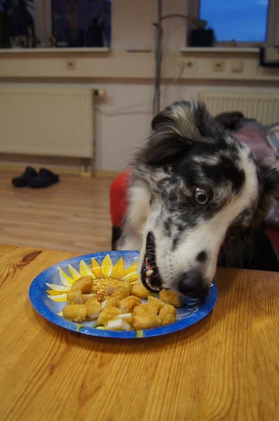 Nachdem das "Nugget-Gemetzel" beendet war, gings an den Nachtisch. Die kleinen Fruchtzwerge so auf dem Tisch zu platzieren, dass sie nicht umfallen, war fürs Fraule die gleiche Herausforderung, wie für die Hunde, ans leckere Innere zu kommen.